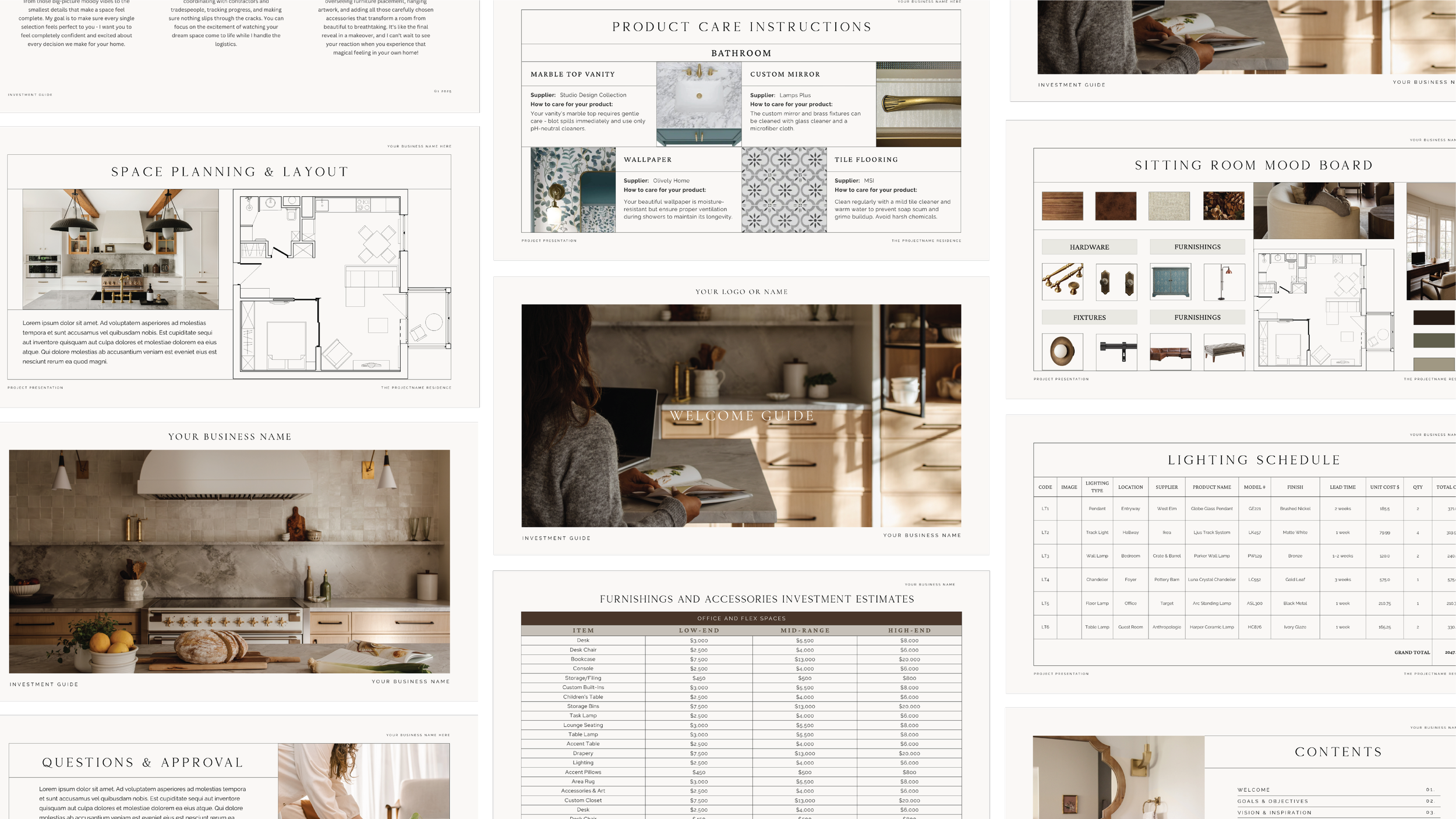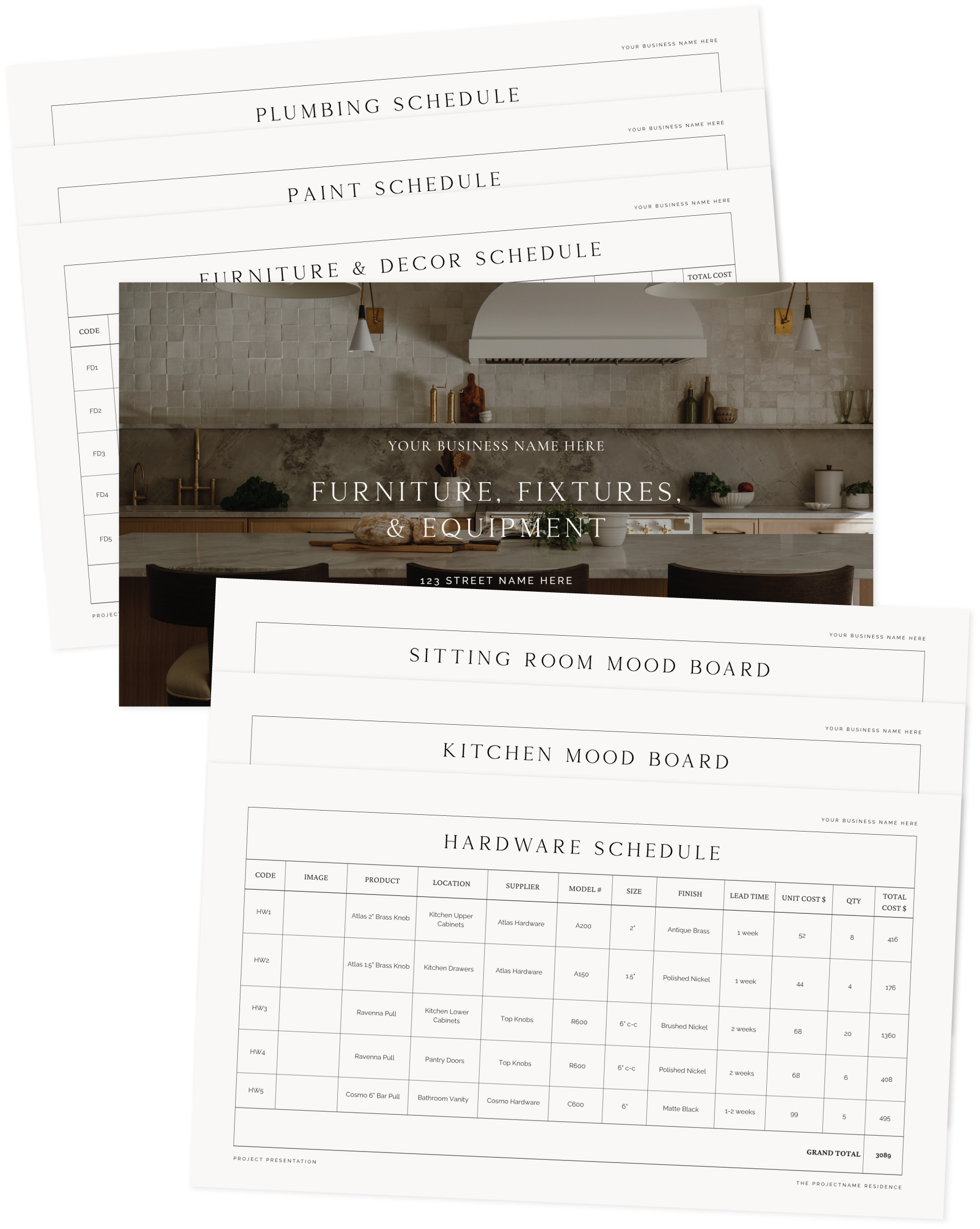 No more thrown-together presentations made using boring, corporate Powerpoint templates. Our templates are editable in Canva, user-friendly, and made for interior designers, with interior designers. Your ideas and stunning work should be presented in a cohesive, polished manner that will wow your clients and prospects.